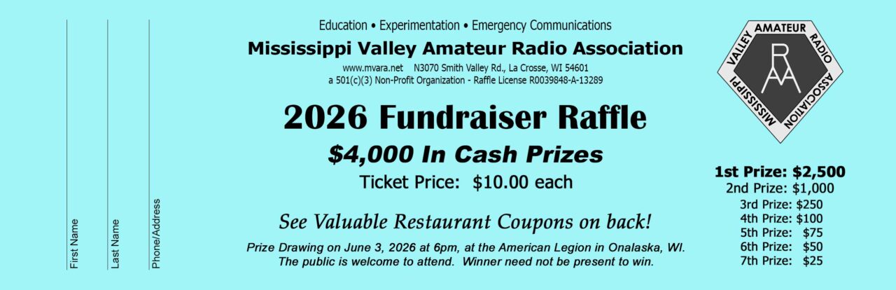 The Mississippi Valley Amateur Radio Association is a 501(c)(3) Non-Profit Organization. State of Wisconsin Raffle License R0039848-A-13289.
